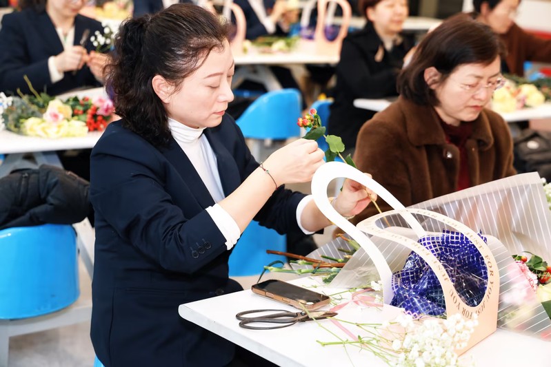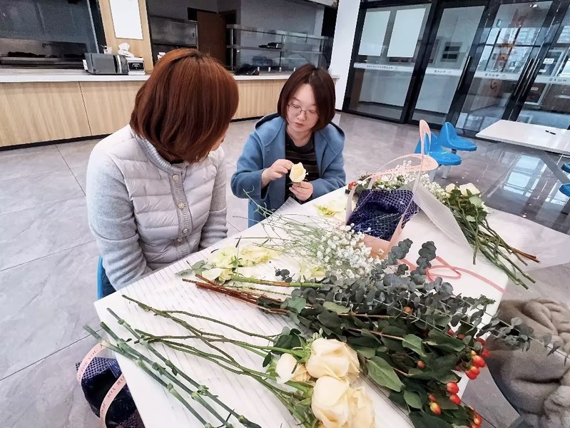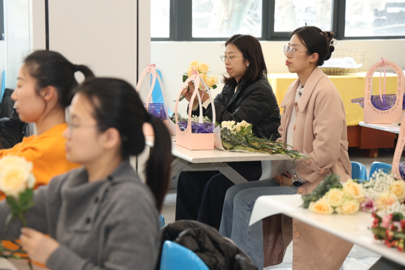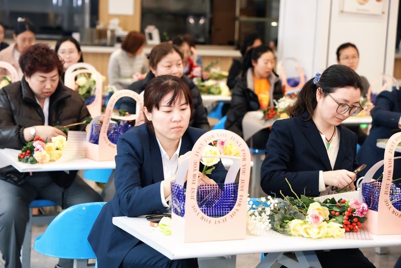 花香氤氲,笑语盈盈。活动现场暖意融融、花香四溢,温柔的康乃馨、玫瑰、灵动的满天星等花材错落摆放,搭配专业插花工具,处处洋溢着浓郁的节日氛围与艺术气息。在专业花艺老师的细致讲解与现场指导下,女职工们兴致盎然地修枝剪叶、搭配造型,在一剪一插、一枝一叶间感受花艺之美,在动手创作中放松身心、舒缓压力。“平时工作比较忙碌,这样的花艺活动太贴心了,既能动手创作,又能放松心情,看着自己插的花,心里满是欢喜。”来自房务部的女职工笑着说道。还有女职工表示:“感谢公司的用心安排,在这个专属节日里,感受到了满满的温暖与尊重,也让我们在忙碌的工作之余,重拾了生活的诗意与美好。”